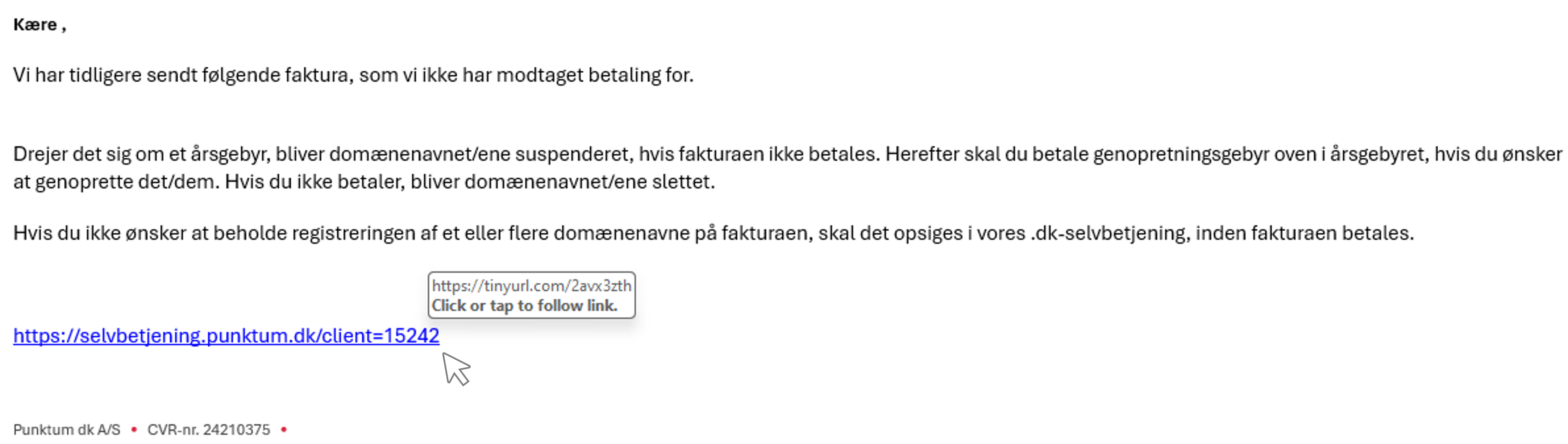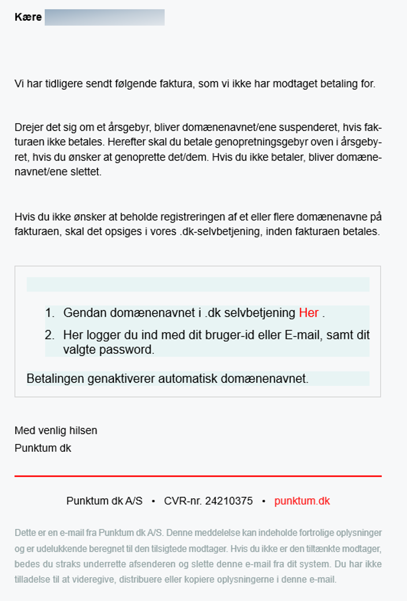 Vi sender samtidig rigtige e-mails ud om suspendering. Vi vil derfor anbefale dig at logge ind på vores selvbetjening og tjekke om dit .dk-domænenavn er suspenderet.