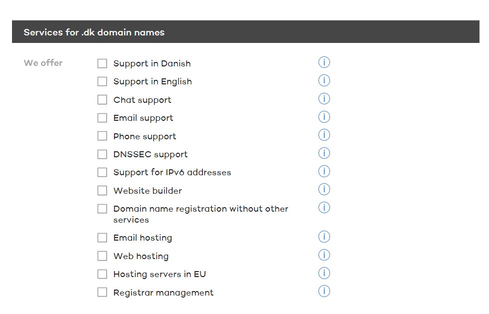The registrar is i.a. responsible for forwarding an application for the .dk domain name to Punktum dk and ensuring that there is an active name service for the domain name on at least two name servers approved by Punktum dk.